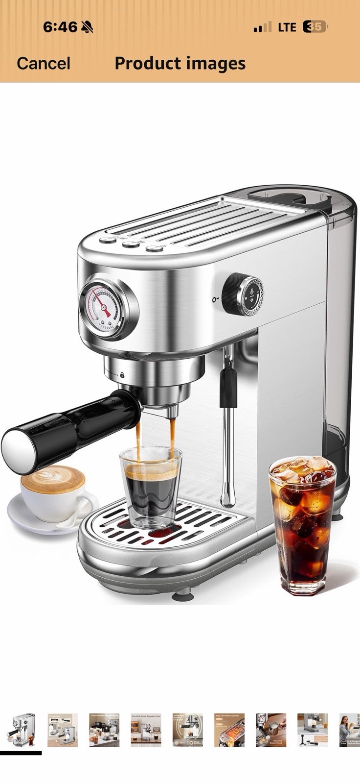 The Espresso Machine with Milk Frother is a versatile 20 Bar Pressure Espresso Maker made of stainless steel. This electric coffee maker is designed to make various types of coffee such as Espresso, Americano, Latte, Macchiato, and Cappuccino. With its sleek silver and black metallic finish, this machine includes features like a steam wand, drip tray, and portafilter for a convenient coffee-making experience. Perfect for brewing your favorite coffee drinks at home with the added convenience of making milk foam for your lattes and cappuccinos.