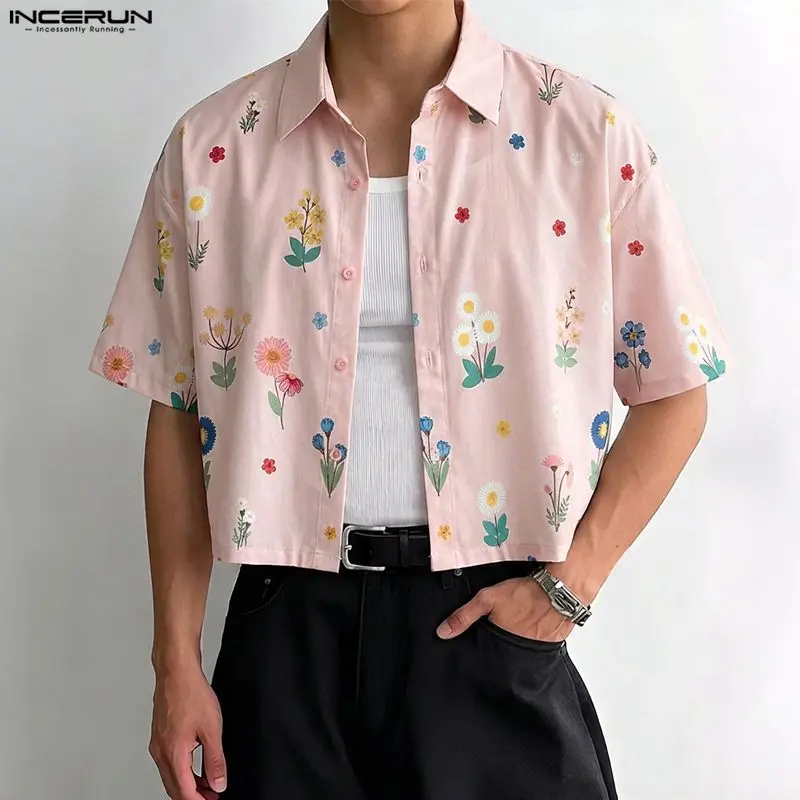INCERUN Men Shirt Flower Printed Lapel Short Sleeve Button Men Clothing Summer Loose 2026 Vacation Fashion Casual Male Crop Tops