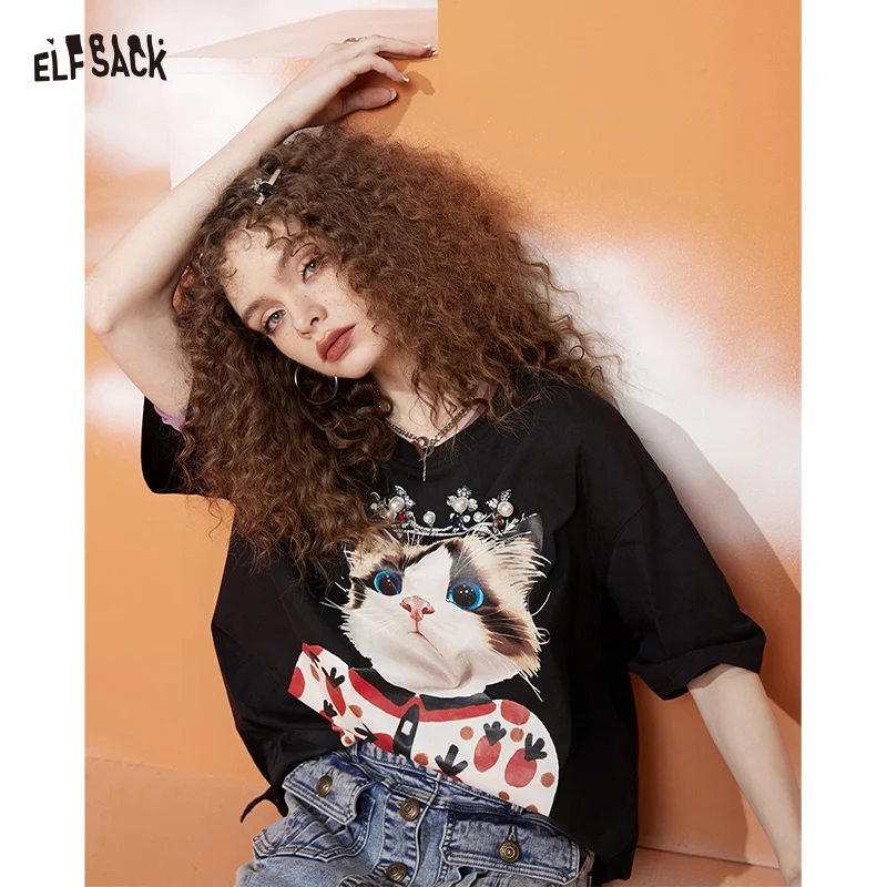 ELFSACK Cute Black T-Shirt with Cat Print, Casual Short Sleeve Graphic Kitten Tee, Oversized Loose Crewneck Top for Women