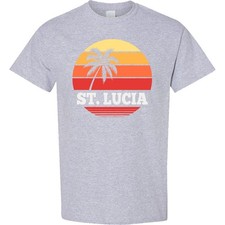 St Lucia vacation design has colorful sunset and a cut out palm tree Wardrobe essential for looking good, 24/7. 5.0 oz., pre-shrunk 100% cotton. Seamless 1x1 rib collar. Shoulder-to-shoulder taping. Double-needle stitched sleeves, bottom hem and front neck...